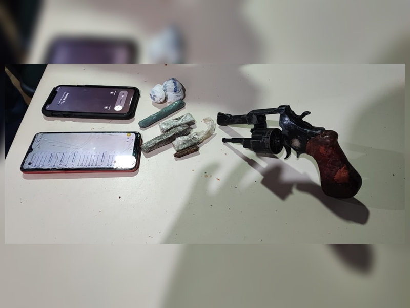 Logo em seguida, a motocicleta foi interceptada e o casal abordado. Aos policiais, eles confessaram ter dispensado uma arma de fogo e certa quantidade de drogas. Foi realizada uma varredura no local, onde os militares encontraram a embalagem citada, contendo um revólver calibre .32 e aproximadamente 39 gramas de maconha.