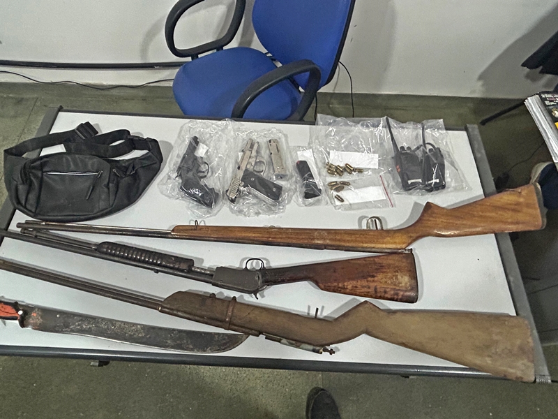 No interior da residência e nas imediações, foram apreendidas duas espingardas de fabricação artesanal, um revólver calibre .32 com numeração suprimida, uma pistola Taurus calibre .380 com carregador e numeração raspada, 13 munições calibre 9mm, uma carabina Rossi calibre .22, uma motocicleta Honda Pop de cor vermelha e dois rádios comunicadores.