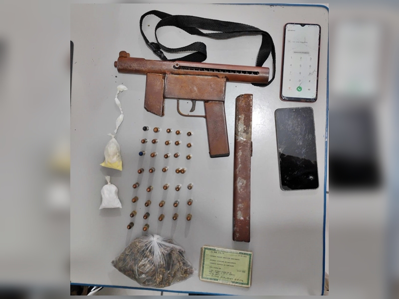 Com a autorização do suspeito, as equipes realizaram buscas na residência, onde localizaram mais drogas, uma submetralhadora calibre 9mm e dois aparelhos celulares. Outros dois indivíduos que estavam no imóvel também foram conduzidos à delegacia, juntamente com o material apreendido.