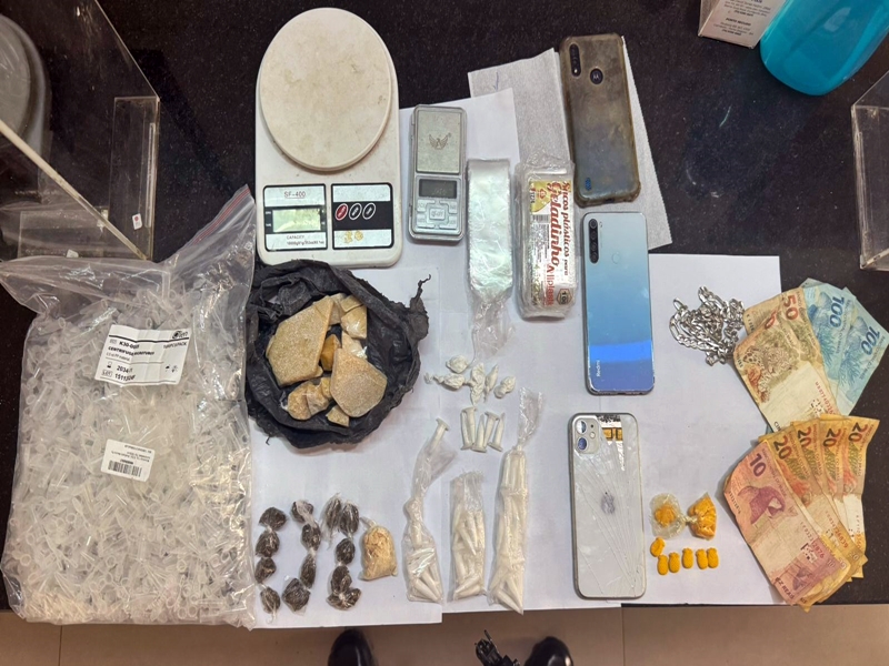 Durante o acompanhamento, um indivíduo adentrou uma residência vindo a ser alcançado e após revista foram encontradas 24 pedras de crack, 13 buchas de maconha, 52 pinos de cocaína, cinco buchas de cocaína, 18 comprimidos de substância similar a ecstasy, um pacote de pinos eppendorf vazios e duas balanças de precisão.