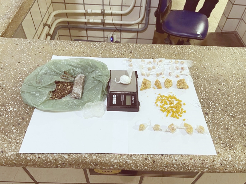 Durante a varredura, os policiais encontraram uma balança de precisão, uma porção de cocaína, totalizando 4 gramas, 36 porções de crack, totalizando 40 gramas e uma porção de maconha, totalizando 20 gramas.