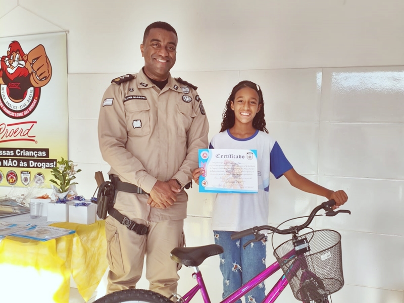 Durante o evento, houve distribuição de presentes para os participantes. A aluna Gabriele Almeida, vencedora do concurso de redação com o tema “O que é o Proerd?”, recebeu como prêmio uma bicicleta, gesto que foi comemorado pelos colegas e familiares.