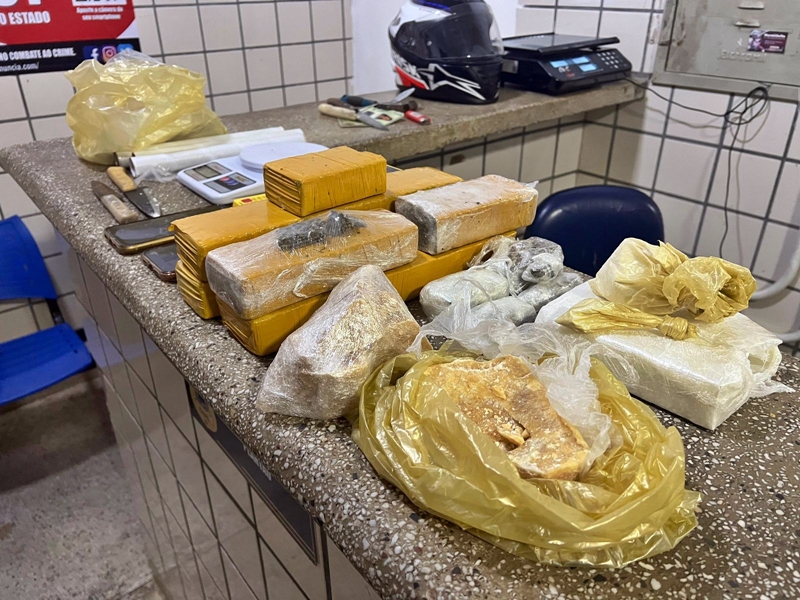 Entre os materiais apreendidos estão aproximadamente 800 gramas de crack, cerca de 800 gramas de cocaína, aproximadamente 3,6 quilos de maconha, duas balanças de precisão, duas máquinas de cartão, dois aparelhos celulares, além de facas e diversos materiais utilizados para a embalagem de entorpecentes.